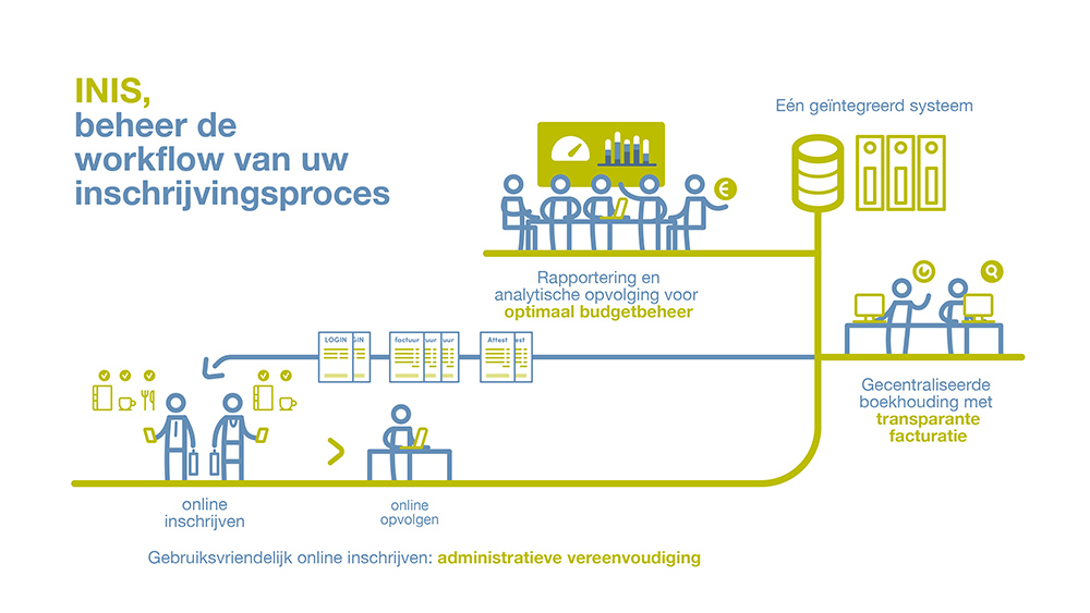 INIS biedt u één centraal systeem voor de volledige afhandeling van alle aspecten van uw registratieproces: van online/on-site registratie van inschrijvingen en deelnemers (studierichtingen, klassen en studenten of leerlingen), over het beheer van alle activiteiten tot en met de online betalingen, facturatie en de rapportering
